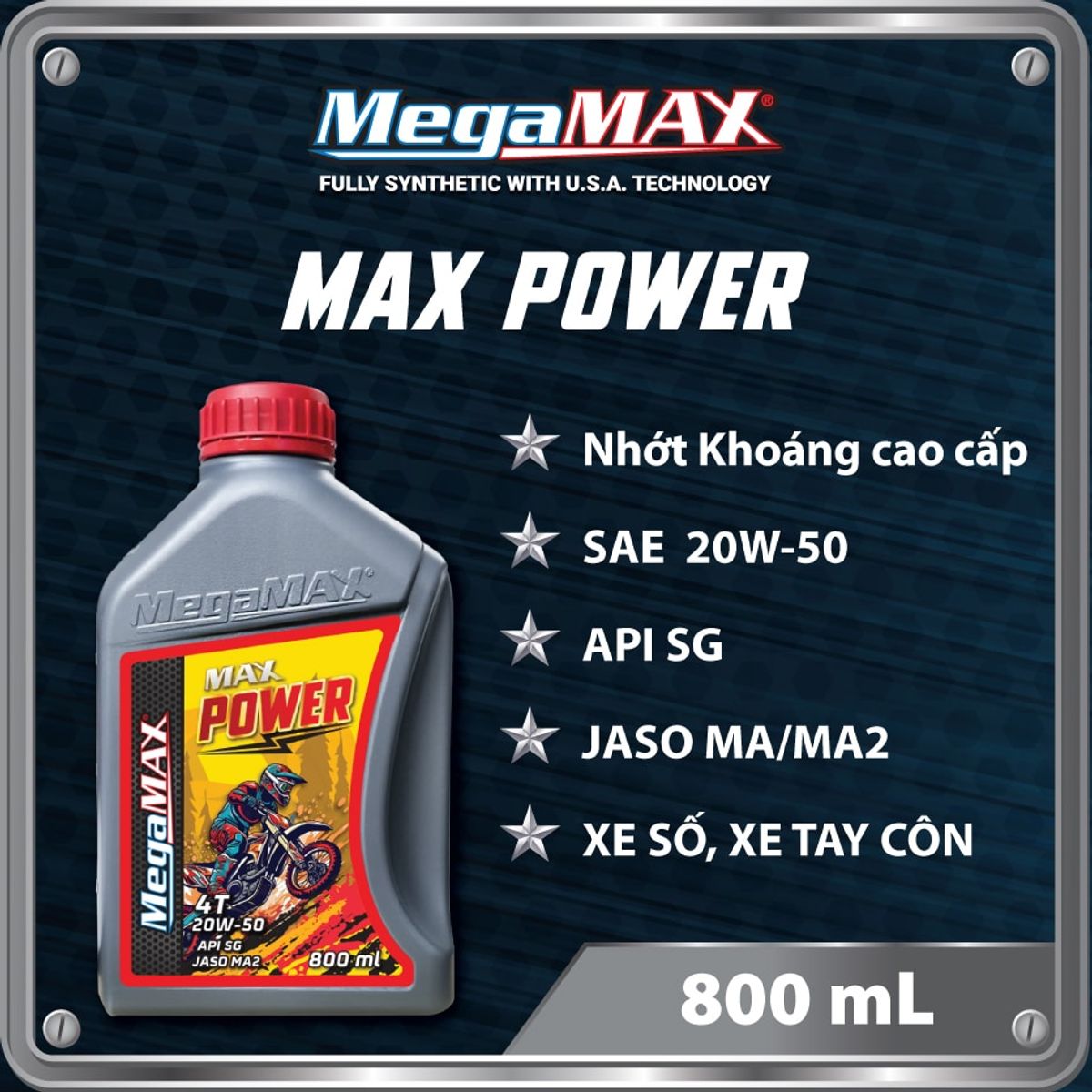 MegaMAX MAX POWER 4T 20W50 Motorcycle Oil – 800ml is a premium mineral oil line with USA technology, delivering excellent anti-wear protection for engines from the initial startup phase through stable oil circulation, ensuring smooth engine operation.