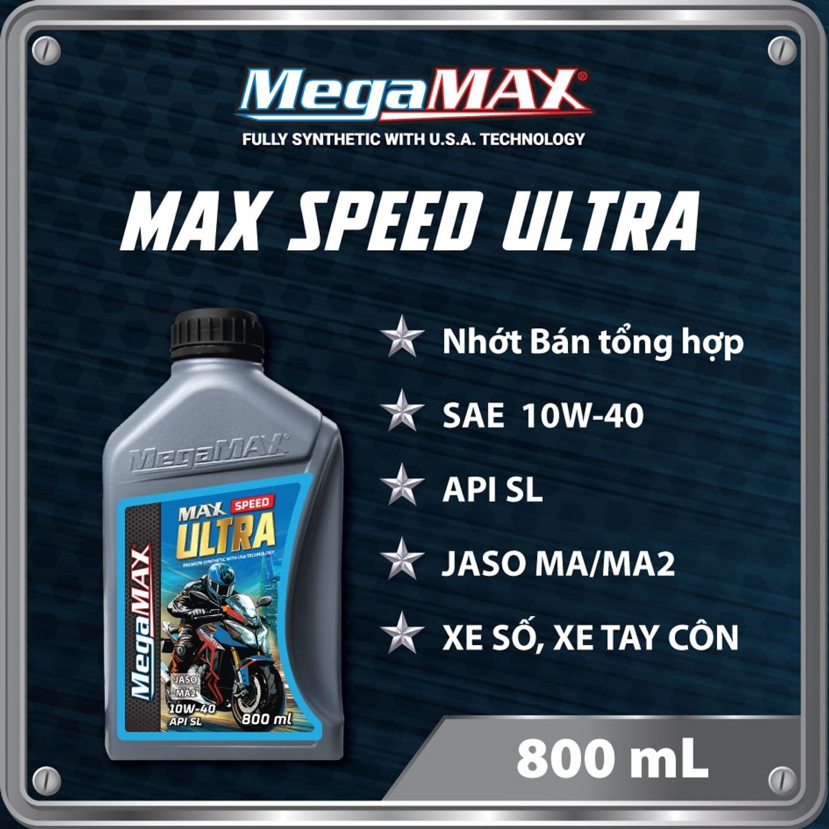 MegaMAX Max Speed Ultra 10w40 Motorcycle Oil – 800ML is a premium semi-synthetic oil line with USA technology, providing excellent anti-wear protection for engines from the initial engine start-up phase until the oil flows smoothly, helping the motorcycle run smoothly.